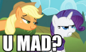 >Fancypants makes an epic social faux pass, ending up stabbing Applejack and running away. Now he's the main suspect, and the easily swayed populace of Ponyville wants his blood.