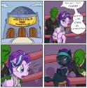 >In the woods, Queen Chrysalis tells Fancypants that villains ought to stick together and offers him to join her, but Fancypants respectfully declines.