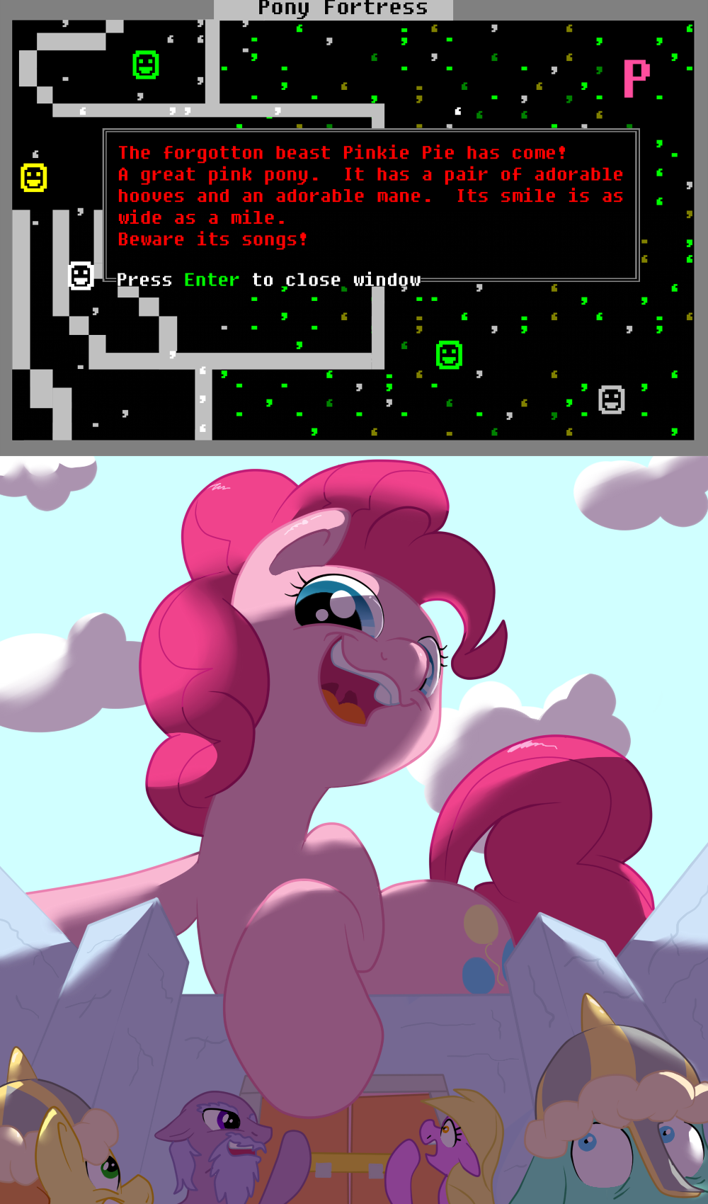 In the dungeon the adventurer tries to climb along the wall, but after three feet loses his grip and falls head-first on the stone floor. No one can tell whether it was a suicide, or just part of the creature's natural madness. Twilight Sparkle recognizes the creature as a human, and sets up a Stargate-style military outpost to guard the EQG-portal device.